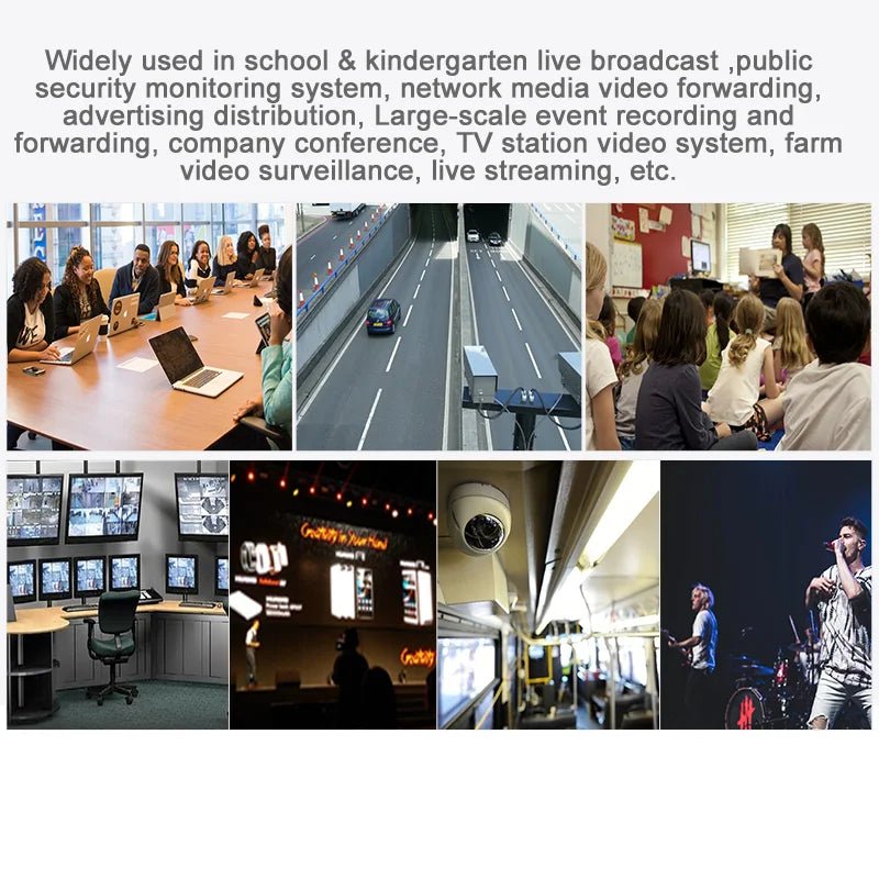 Widely used in School and kindergarten live broadcast , Public security monitoring system, Network media video forwarding,Advertising distribution, Large-scale event recording and forwarding, Company Conference,TV station video system Farm video surveillance Webcast,etc