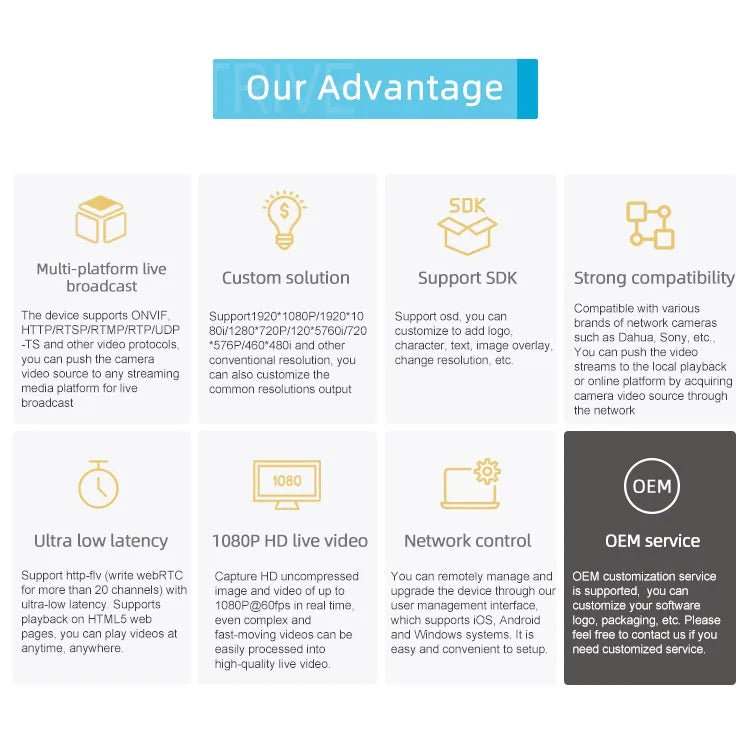 Products are sold to hundreds of laboratories and institutions in China. We can provide a complete set of solutions for video capture, video transmission, and video management. Also we provide high-quality products, which support OEM and ODM customization.