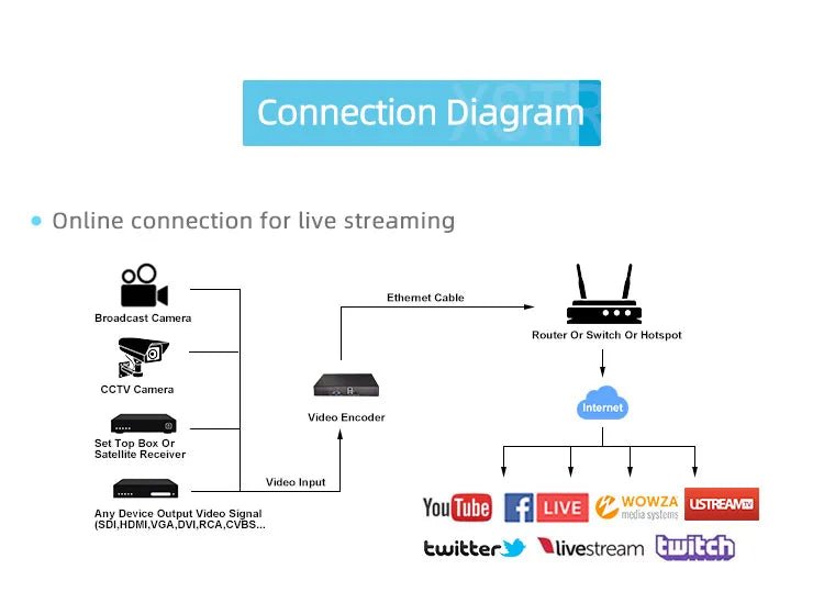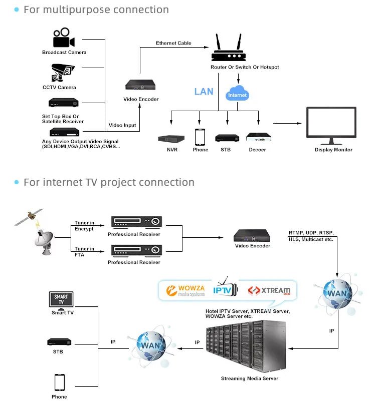 Widely used in live broadcast, digital signage, multimedia display, hotel IPTV system, network video conference, network teaching, online TV, live broadcast of large event party.