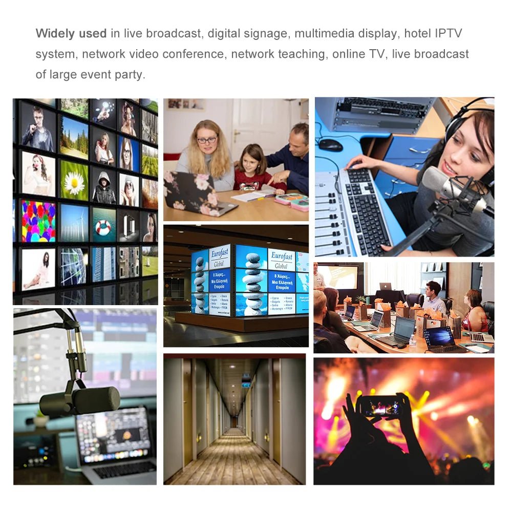 Widely used in live broadcast, digital signage, multimedia display, hotel IPTV system, network video conference, network teaching, online TV, live broadcast of large event party.
