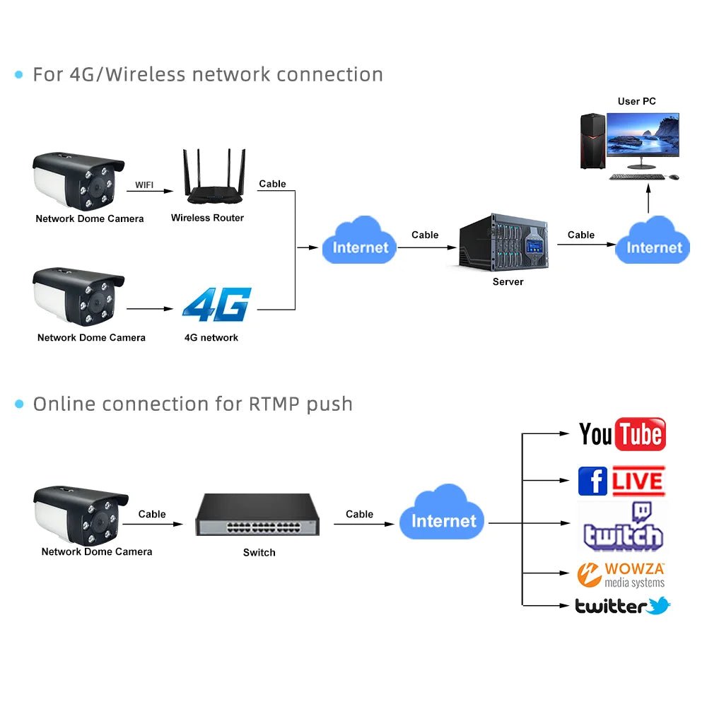 1.Support standard ONVIF , RTMP and RTSP protocol. 3.Effectively reduce network bandwidth withH264/H265 compression algorithm and dualstream support. 6. Support playing and downloading SD cardvideos from PC or mobile phone