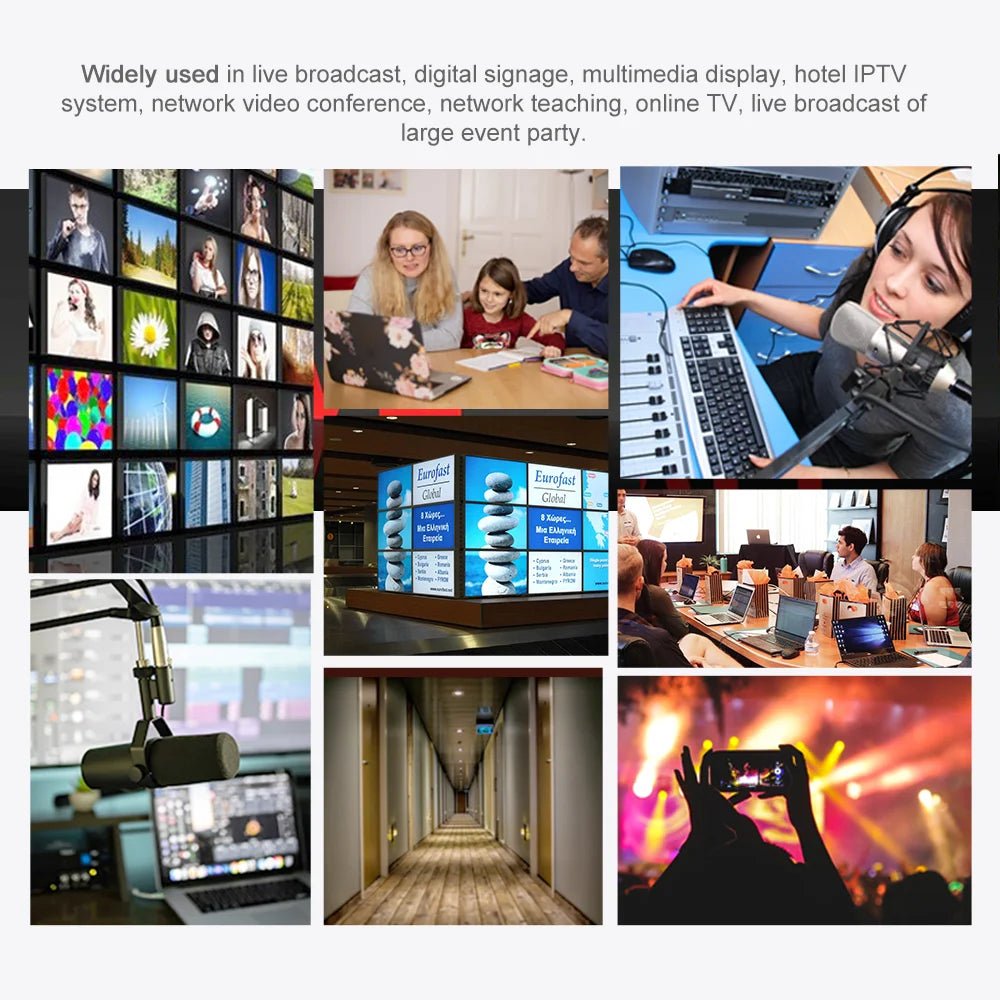 Widely used in live broadcast, digital signage, multimedia display, hotel IPTV system, network video conference, network teaching, online TV, live broadcast of large event party.